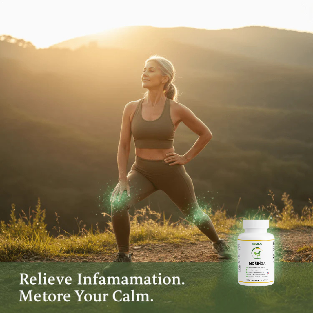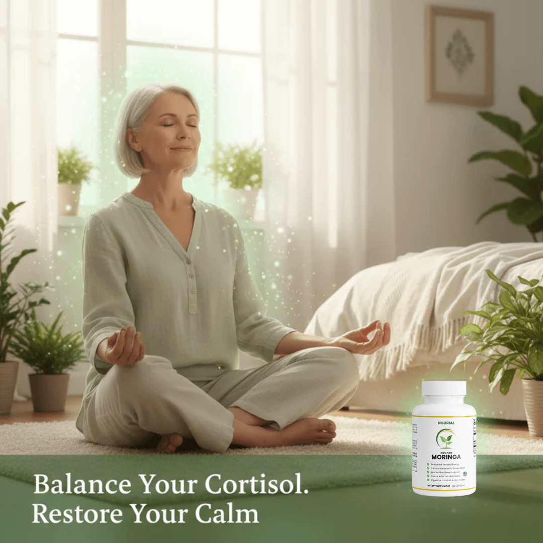 Nourial Moringa harnesses the power of over 92 bioactive nutrients to naturally reduce inflammation and cortisol — the hidden causes behind your fatigue, brain fog, joint pain, and sleepless nights.